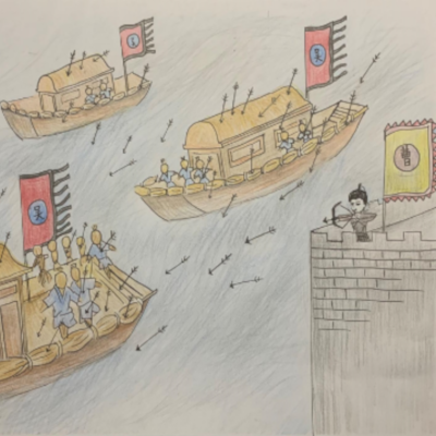 It was not long before the straw men on the boats were so full of arrows that the boats were leaning over to one side, so Zhu Ge Liang ordered them to turn around and face West. The men continued to beat the drums and shout until they had collected just as many arrows on the other side, then they all shouted, “Thank you!” Cao Cao realised that he had been tricked, but there was nothing he could do about it. The boats had already rowed home, taking his arrows with them.